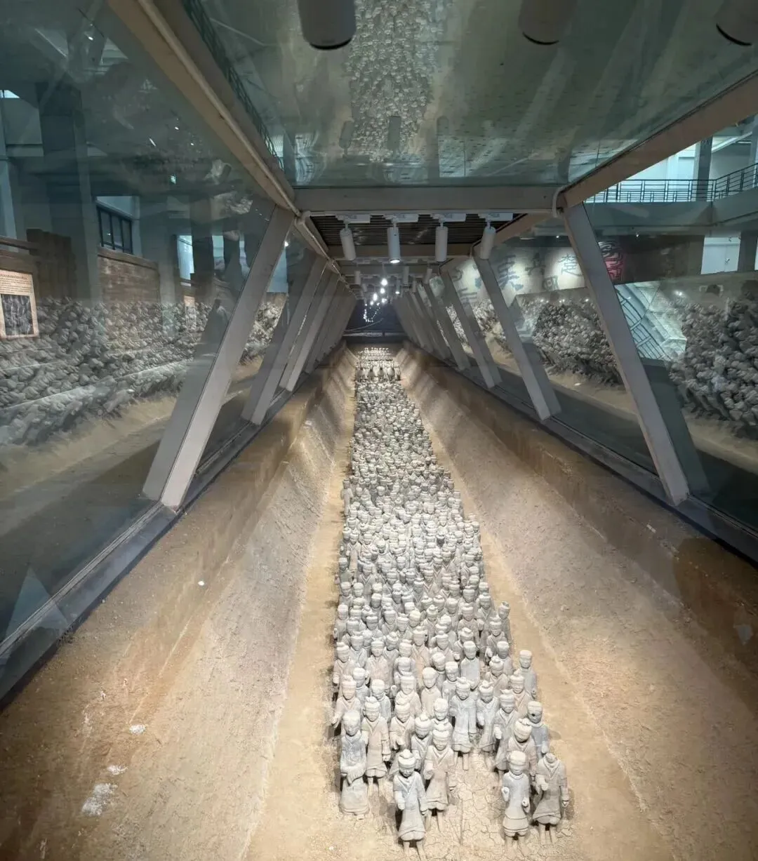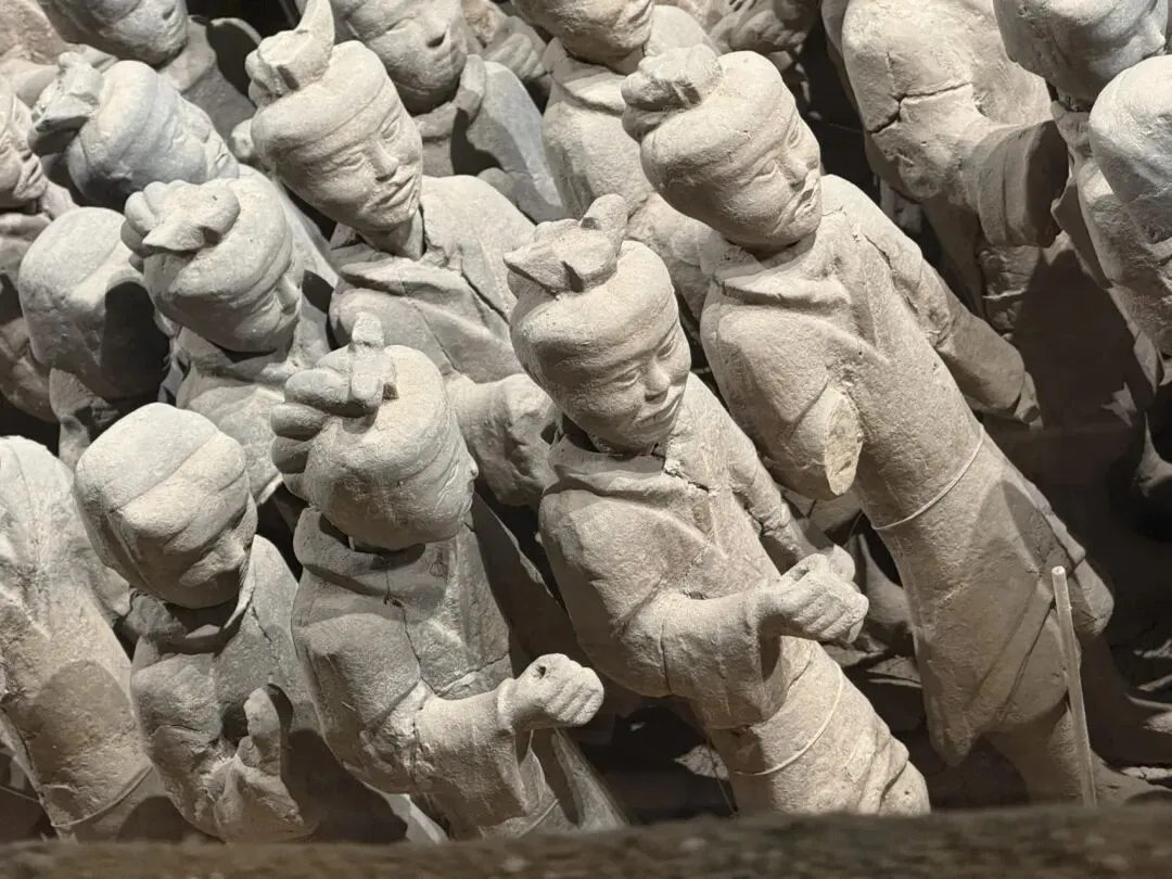 上个世纪80年代发掘到的狮子山楚王陵到底是哪个楚王咱也不知道。起初先是挖到的汉代小兵马俑,此后很多年就是找不到主墓道。与秦俑呈现两种截然不同的风貌。也是两个文化下不同的产物。汉朝建立后,为了国家的长治久安,休养生息,完全摒弃了秦朝的好大喜功,陶俑作为陪葬用的偶人不再像真人一样高大,俑体开始缩小,陶俑制作改雕塑为模制,从此开启了中国古代陶俑小型化、模具化批量生产的先河。
