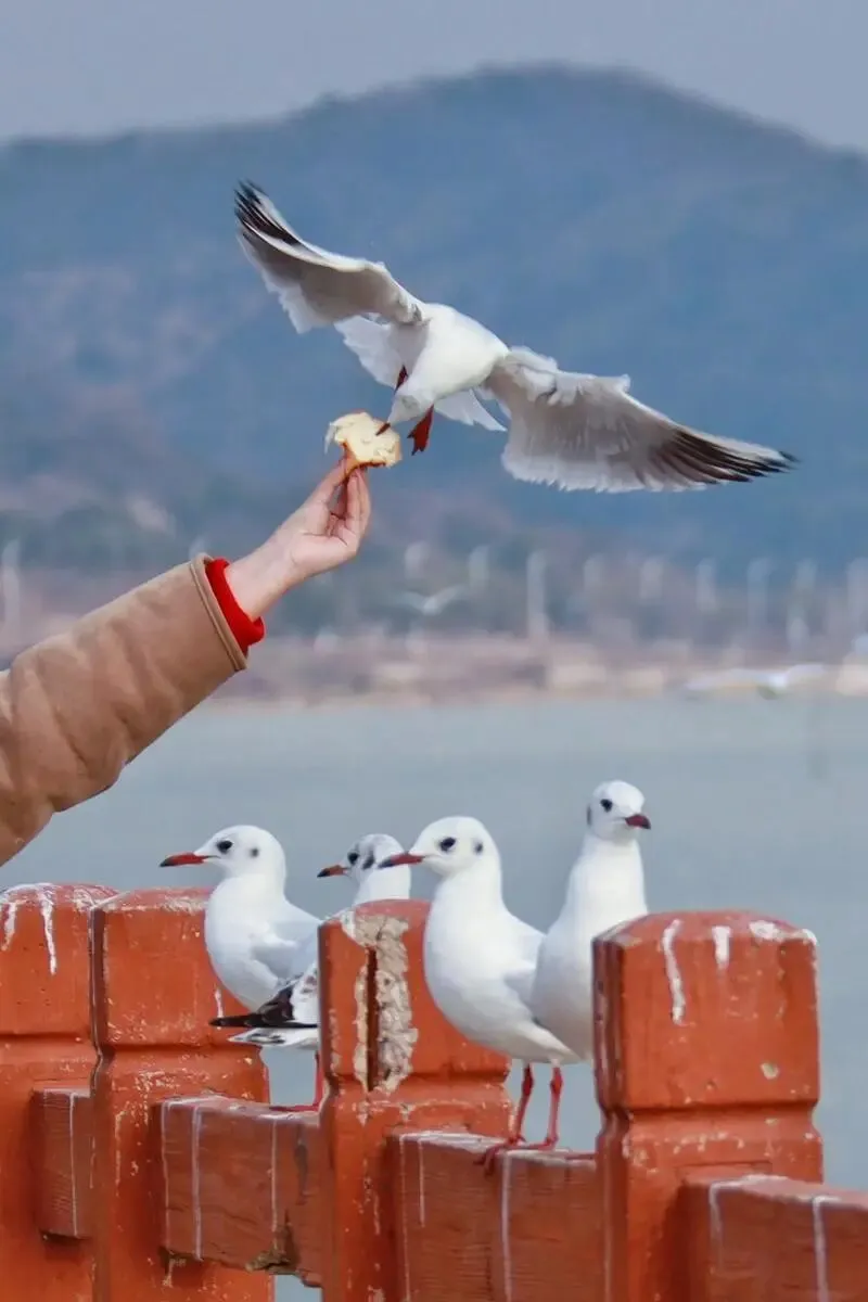 投喂礼仪: 红嘴鸥主食为鱼虾,投喂应以原味面包、白馒头为宜,严禁投喂火腿肠、薯片等高盐高油人工食品,以免损害鸟类消化系统。投喂时保持静止,将食物举过头顶,待鸥群主动前来啄食,体验"指尖亲吻"的温柔触感。