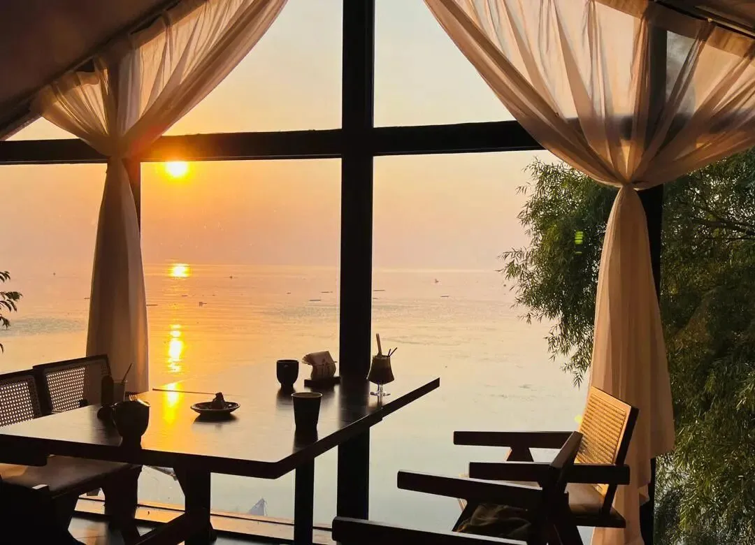 位于漫山渡码头旁的暮刻书坊,是近年声名鹊起的网红观鸥据点。这座拥有270度全景落地窗的湖畔书房,将"围炉煮茶"的中式雅趣与"人鸥互动"的自然野趣完美融合。择一临窗雅座,手捧热茶,看窗外红嘴鸥在"橘子海"的光影中时而如箭矢般俯冲,时而如落叶般飘旋。二层的观景露台更是拍摄剪影的绝佳机位——当夕阳将书坊的轮廓与鸥群的身影投射在金色的湖面上,时间仿佛在此刻凝固。