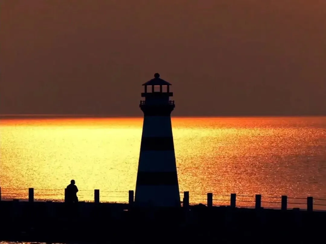 灯塔剪影:以屿见灯塔为前景,红嘴鸥群为背景,逆光拍摄金色轮廓;