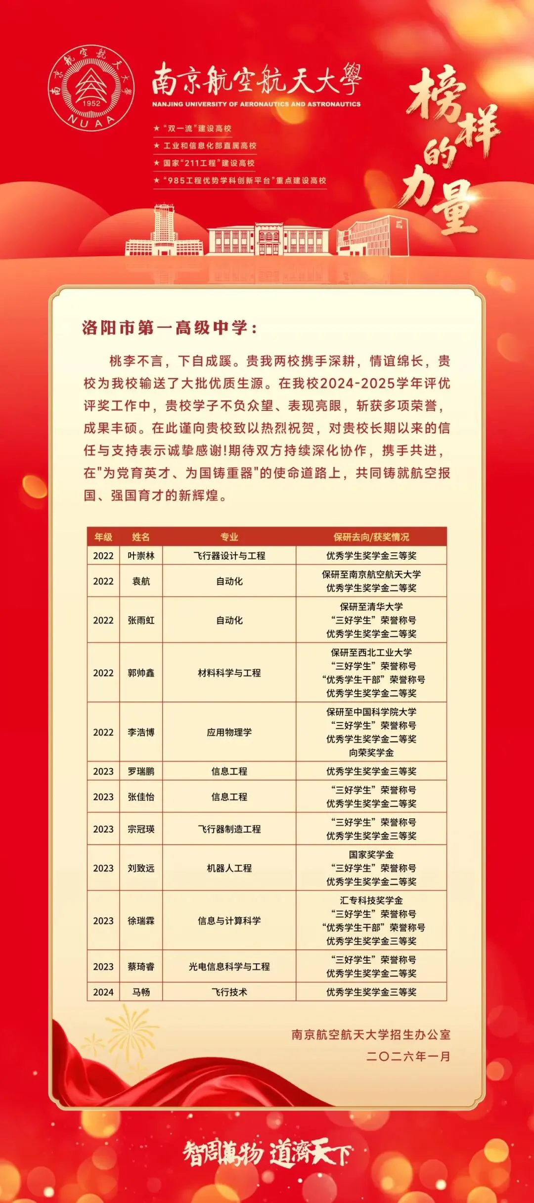 近日,南京航空航天大学向我校发来喜报,我校多名毕业生在南京航空航天大学学习成绩优异,表现亮眼,斩获多项荣誉,成果丰硕。为母校争得了荣誉,特发来喜报表示祝贺!