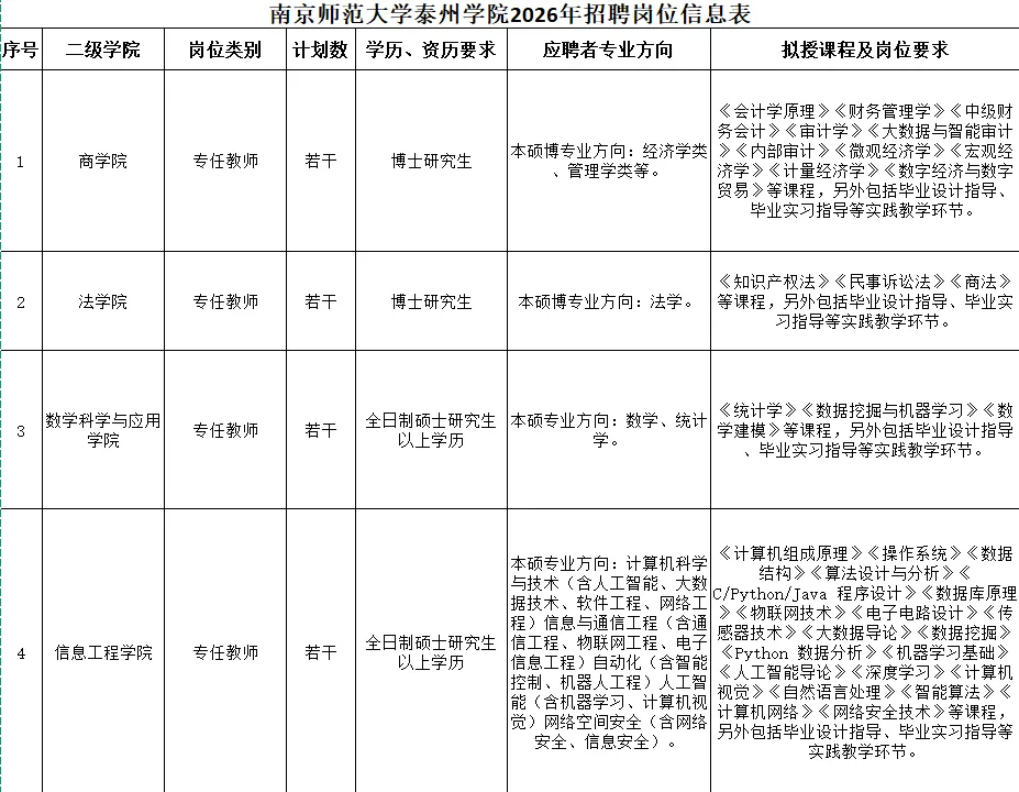 南京师范大学泰州学院2026年招聘岗位表