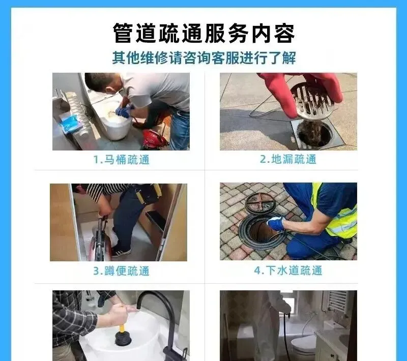 疏通服务:下水道、马桶、蹲厕、地漏、下水管、脸盆、菜盆、墩布池、坐便器、小便池、主管道。