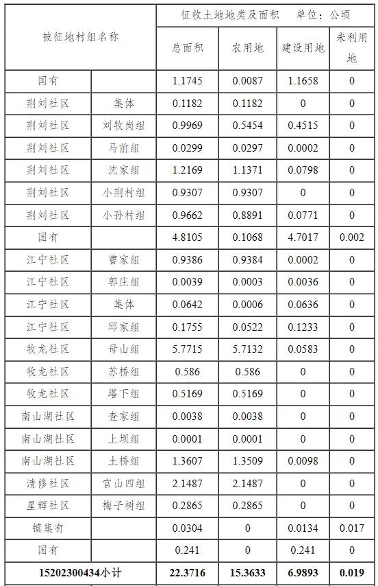 建设用地项目名称为拟建设宁芜铁路扩能改造工程项目,征地范围主要位于谷里街道、江宁街道,涉及荆刘社区、江宁社区、牧龙社区等多个村组,总面积涵盖大量农用地、建设用地和少量未利用地。