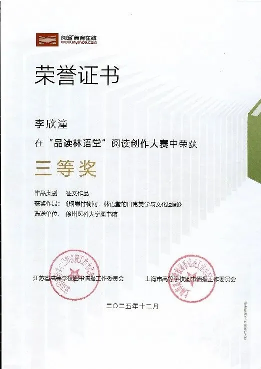 全国性阅读赛事“品读林语堂”阅读创作大赛中,荣获优秀组织单位奖、三等奖1项以及优秀组织个人奖