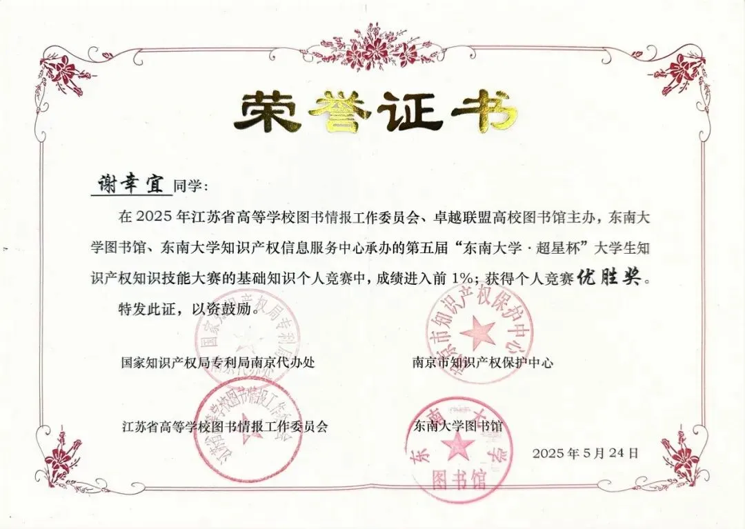 第五届“东南大学·超星杯”大学生知识产权知识技能大赛荣获大赛个人竞赛优胜奖