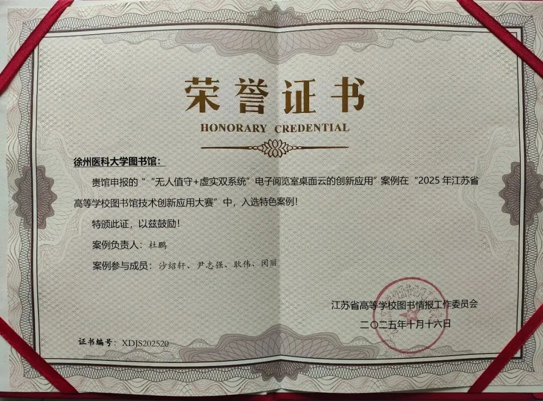 《“无人值守+虚实双系统”电子阅览室桌面云的创新应用》实践案例入选“2025年江苏省高等学校图书馆技术创新应用大赛”特色案例