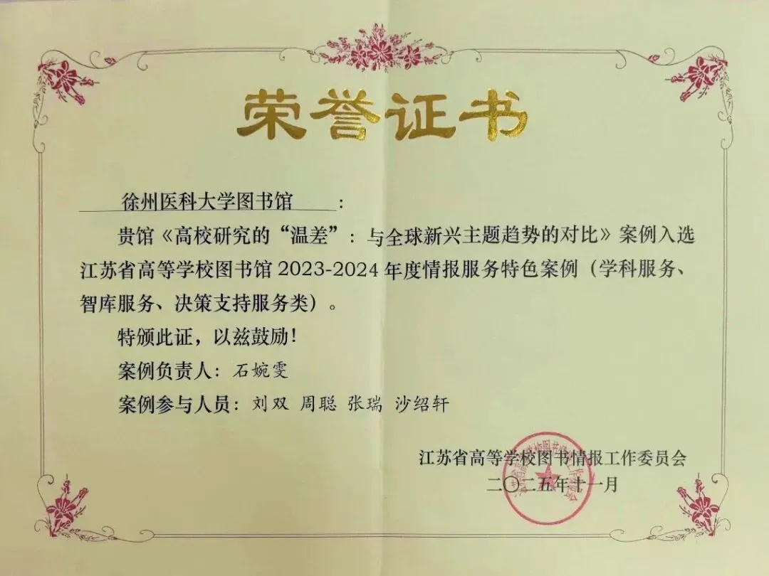 《高校研究的“温差”:与全球新兴主题趋势的对比》案例入选江苏省高等学校图书馆2023-2024年度情报服务特色案例