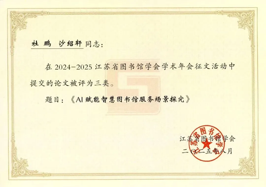 《AI赋能智慧图书馆服务场景探究》获2024-2025江苏省图书馆学会学术年会论文三等奖