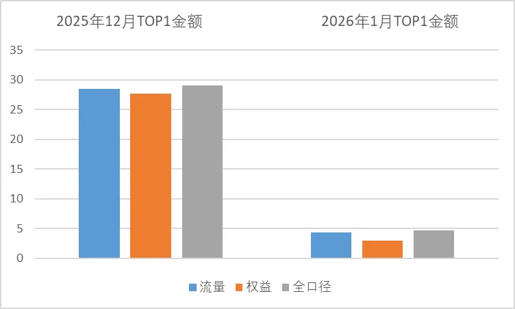 从三口径单月TOP1金额数据来看,今年1月份的权益、流量、全口径TOP1房企销售额均低于2025年月度平均水平,其中1月权益TOP1销售额2.99亿元,环比下降89%;流量TOP1销售额4.27亿元,环比下降85%;全口径TOP1销售额4.66亿元,环比下降84%。主要由于2025年12月部分企业房源由政府收购,成交金额较大,因此本月数据回落明显。