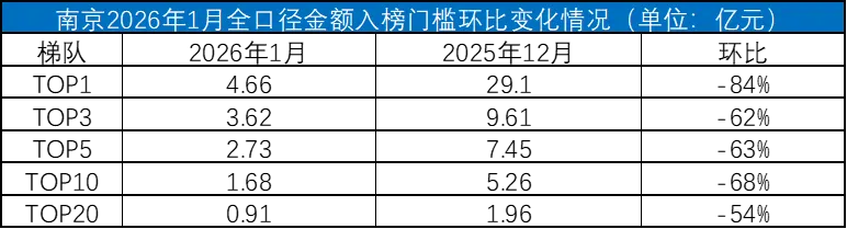 1月,南京全口径榜各梯队销售,各TOP榜单入榜门槛均环比下降,TOP3入榜门槛下滑62%,门槛值为3.62亿元,TOP5入榜门槛下滑63%,门槛值为2.73亿元,TOP10入榜门槛下滑68%,门槛值为1.68亿元从全口径TOP20榜单来看,各梯队占比均有所下滑,其中TOP3房企累计业绩12.88亿元,占比为31%,下滑8个百分点。TOP5房企业绩累计单月业绩达19.19亿元,占比46%,降幅约5个百分点。TOP10房企累计单月业绩29.74亿元,占比约71%,降幅约4个百分点; 从企业业绩来看,中国金茂本月凭借金茂·樾满云川、江宁金茂府等项目助力,包揽本次全口径、权益、流量榜三榜榜首。