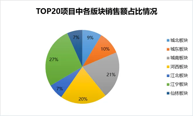 Top20项目榜中,河西累计4个项目上榜,销售额达3.7亿元,占前20强市场总成交额的20.5%,本月板块份额领先主要受贤坤花园二期、中宁府等项目影响,这两个项目分别是1月项目金额榜单TOP4、TOP5;其次是江宁3个项目上榜,占前20强市场总成交额的26.7%,主要为万科都荟滨江、江宁金茂府,其中万科都荟滨江项目为本月TOP1成交;城中、高淳、溧水等板块均无项目入榜。
