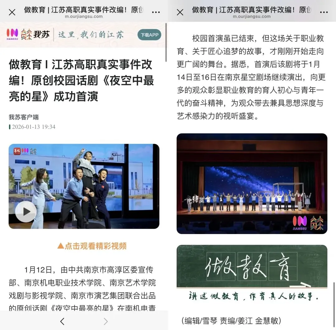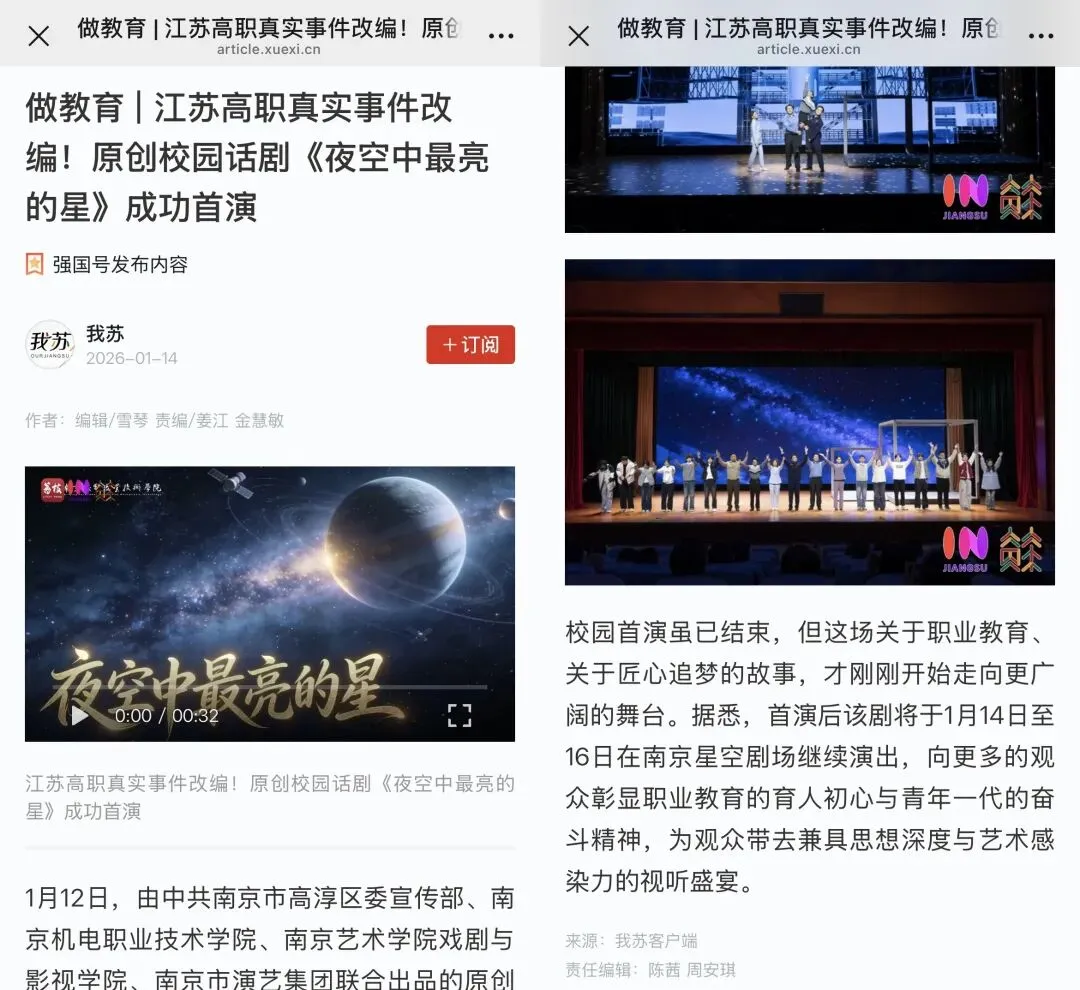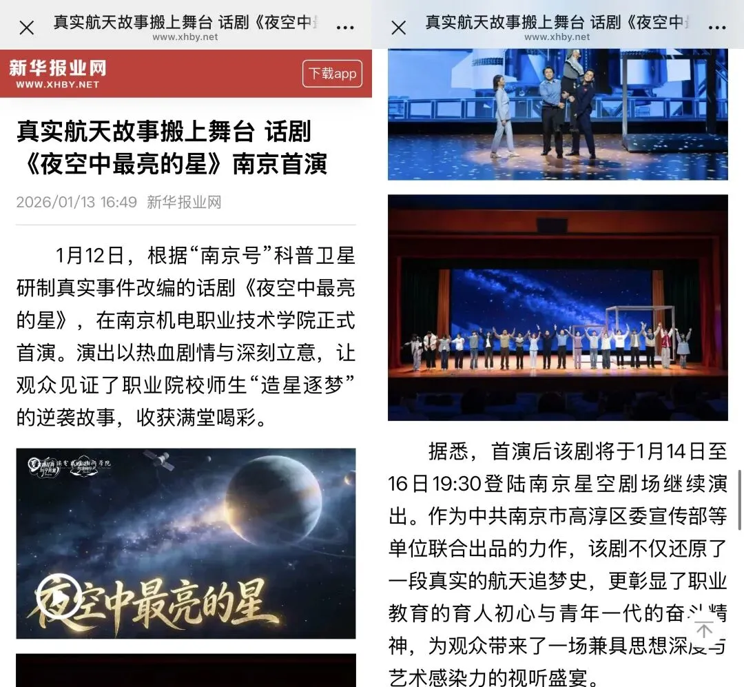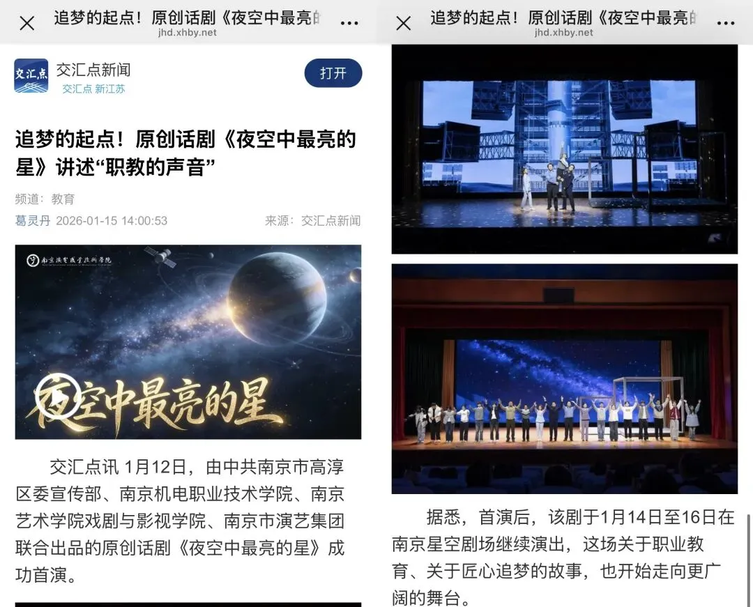 1月14日至16日,该剧在南京星空剧场持续上演。此轮演出结束后,《夜空中最亮的星》将带着这场关于职业教育和匠心追梦的故事,走向更多的学校、剧院和更广阔的舞台。
