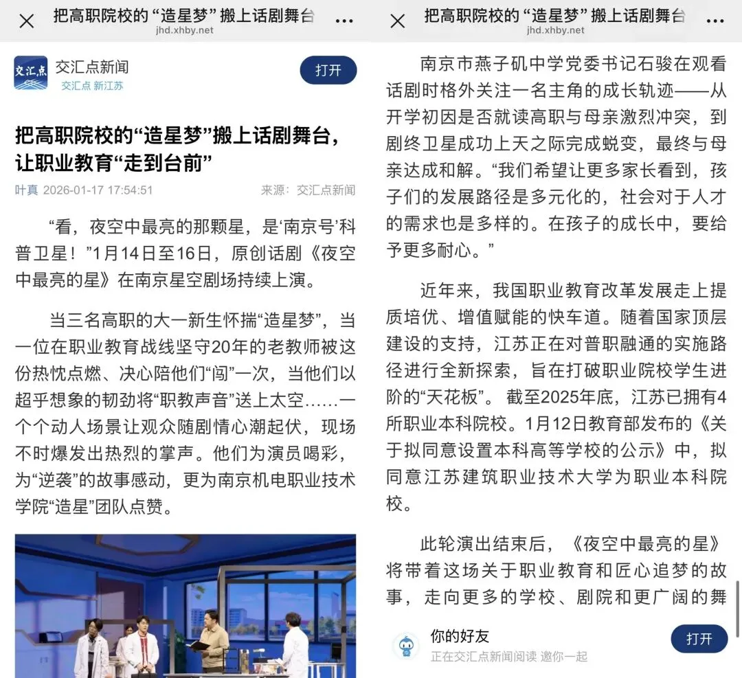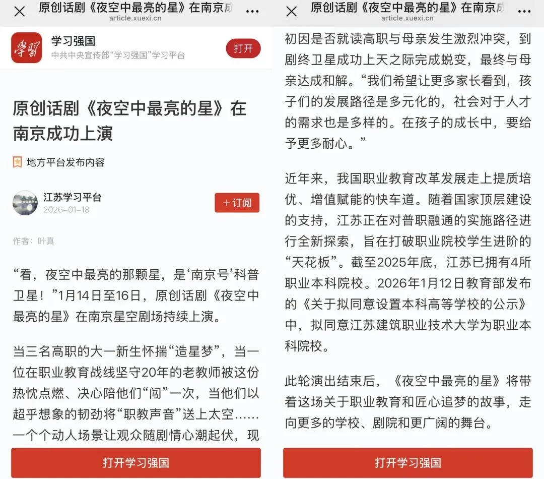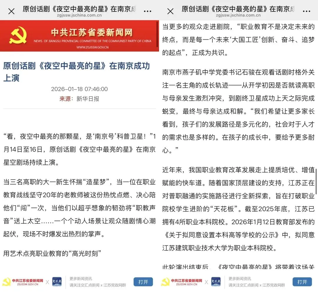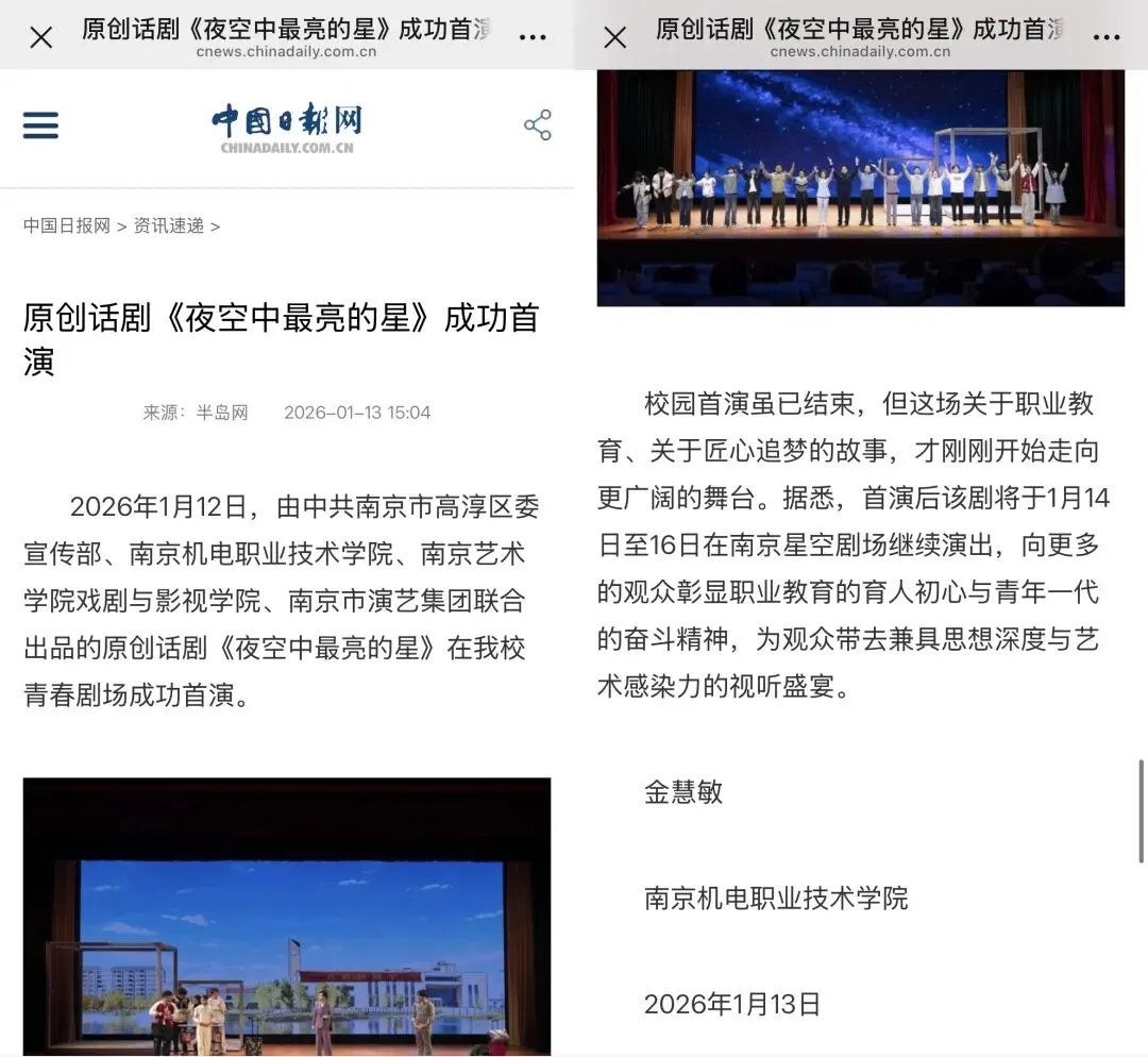 1月14日至16日,该剧在南京星空剧场持续上演。此轮演出结束后,《夜空中最亮的星》将带着这场关于职业教育和匠心追梦的故事,走向更多的学校、剧院和更广阔的舞台。