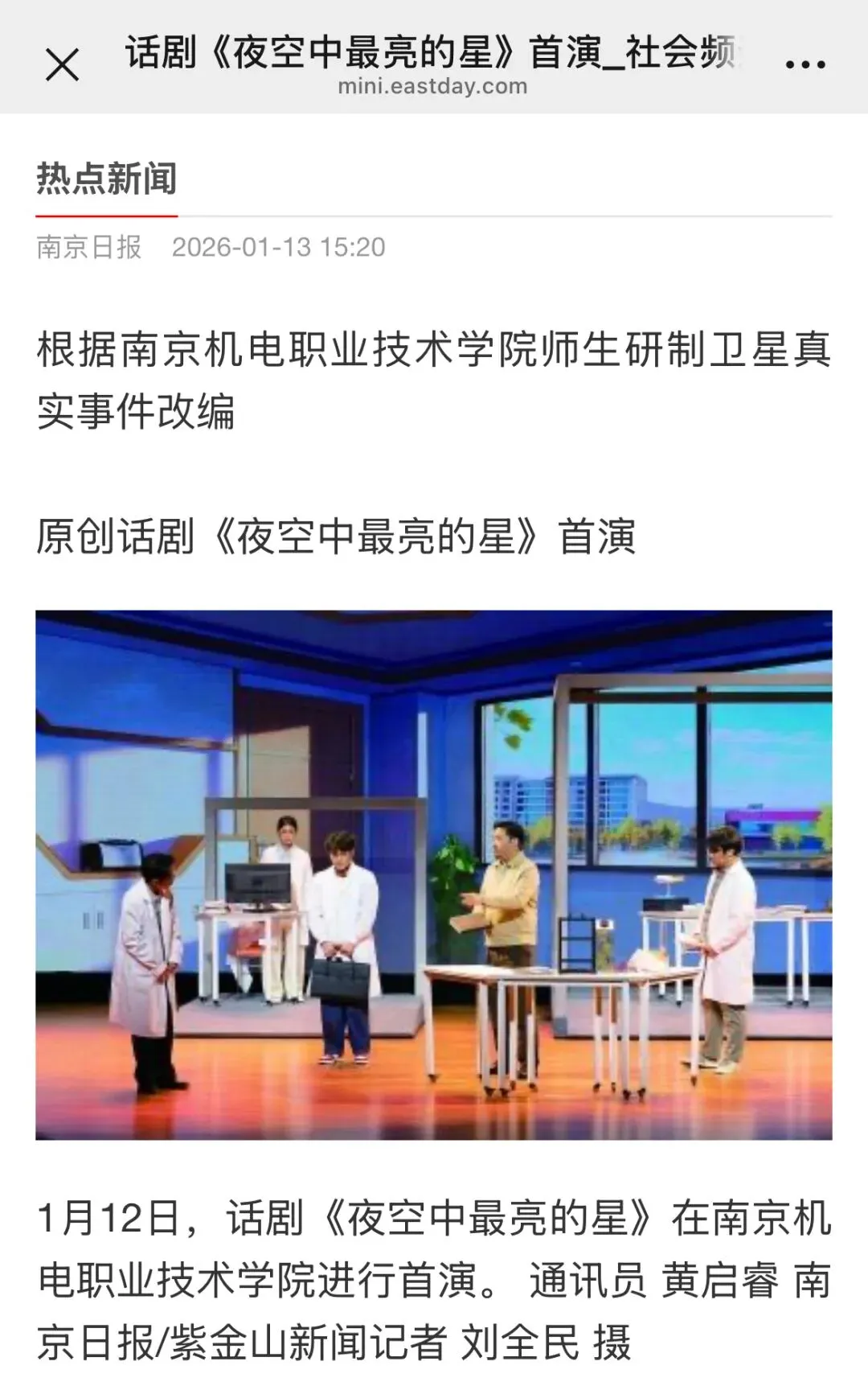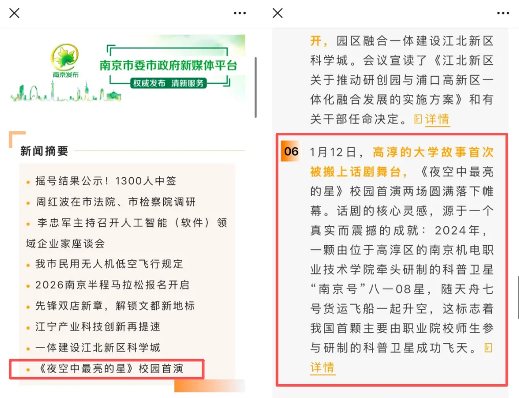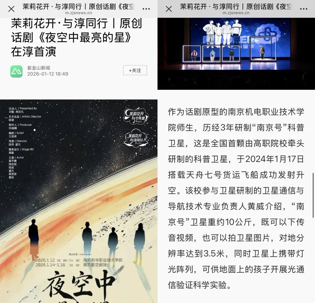 南京机电职业技术学院师生作为话剧的创作原型,历经3年研制“南京号”科普卫星。这是全国首颗由高职院校牵头研制的科普卫星,于2024年1月17日搭载天舟七号货运飞船成功发射升空。南机电参与卫星研制的卫星通信与导航技术专业负责人黄威介绍,“南京号”卫星重约10公斤,既可以下传音视频,也可以拍卫星图片,对地分辨率达到3.5米,同时卫星上携带灯光阵列,可供地面上的学生开展光通信验证科学实验。