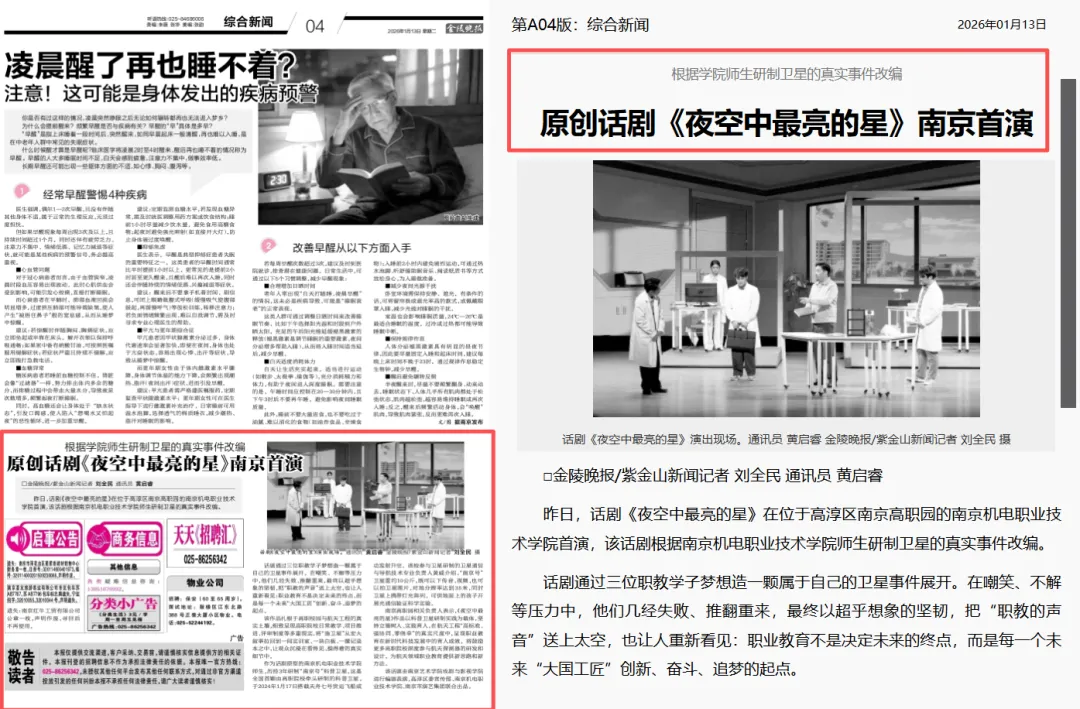 1月12日,由中共南京市高淳区委宣传部、南京机电职业技术学院、南京艺术学院戏剧与影视学院、南京市演艺集团联合出品的原创话剧《夜空中最亮的星》在南京机电职业技术学院校青春剧场成功首演。