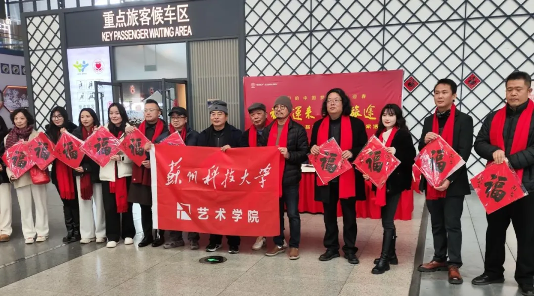 2月1日上午,“福至运来 情满旅途——2026江苏省千名书法家送万福进万家活动(苏州站)”在苏州火车站温暖启幕。作为省级重点文化惠民品牌,本次活动由省文联、省广电总台等单位联合主办,苏州市书协、铁路苏州站及苏州科技大学艺术学院工会、中国书法文化研究所共同承办。我院美术系教授、省书协副主席、苏州市书协主席王伟林与学院工会委员顾邦军老师参加活动,以笔墨传递马年新春的诚挚祝福。