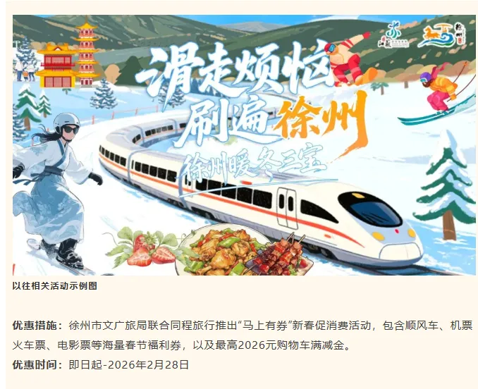 此外,徐州市文广旅局联合同程旅行推出“马上有券”新春促消费活动,包含顺风车、机票火车票、电影票等海量春节福利券,以及最高2026元购物车满减金。