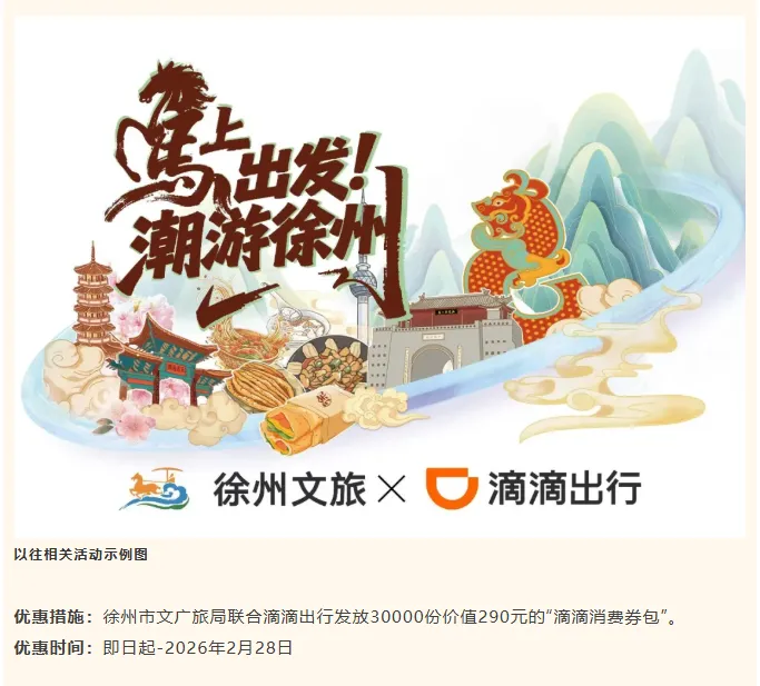 徐州全市区文化馆、博物馆以及图书馆等公共文化场馆春节期间延时开放。徐州市文广旅局联合滴滴出行发放30000份价值290元的“滴滴消费券包”。