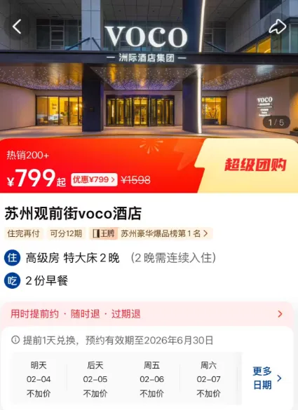 366/晚(799*4-300券)苏州观前街voco,全程不加价,26年开业的IHG新酒店,有效期到6月30日,全程不加价,周末不加价。