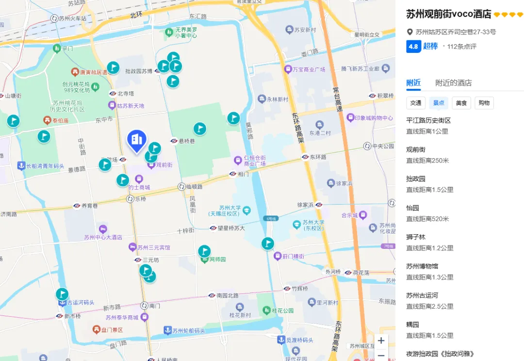 酒店位置非常好,就在观前街边上,吃吃逛逛超有氛围,苏州老城的景点环绕周边,周边都是苏州园林地标景点,拙政园、网师园、平江路历史街区都步行可达。步行距离有1号线4号线,苏州火车站直达。