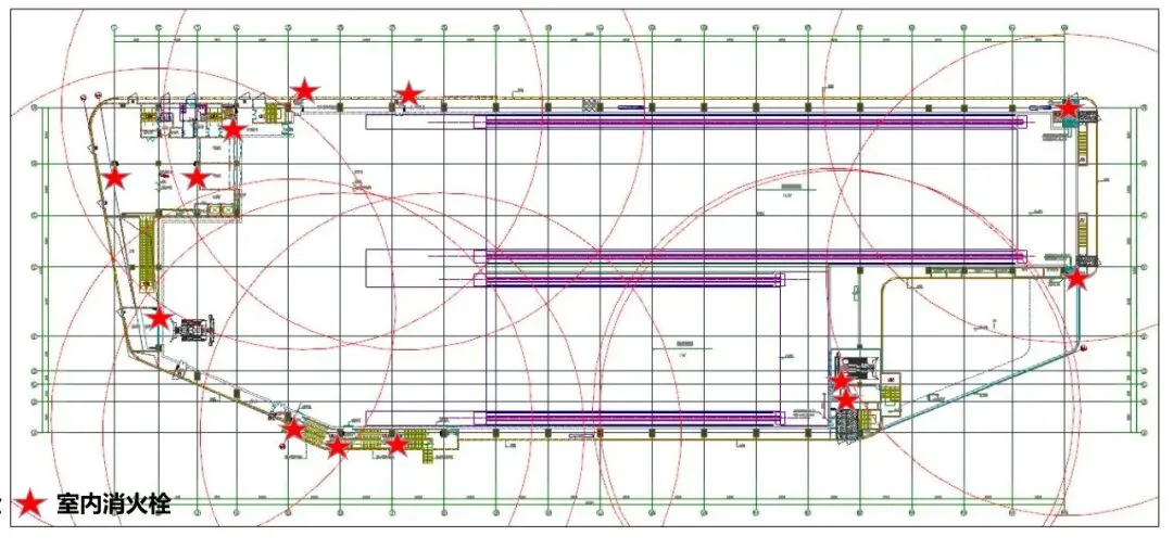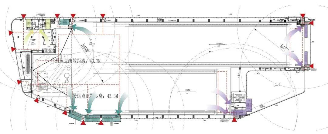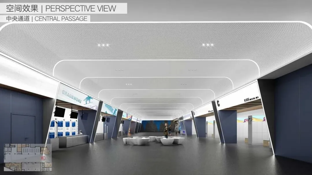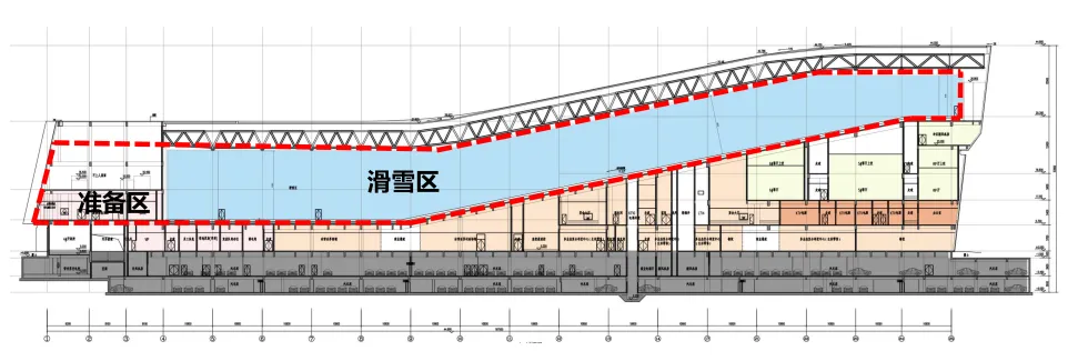 滑雪场冷区及暖区准备区按一个防火分区设计,面积达到11520㎡,疏散距离按行走距离45米设计,实现了超大空间的使用需求。消防设施采取了超长消火栓水带、布置雪橇推车推车贮压式 ABC 干粉灭火器、特大型疏散方向标识灯具、安全出口设置带有语音提示的声光警报装置等补强措施。