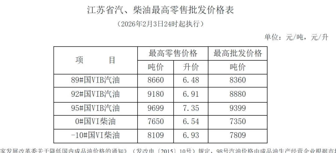 根据国家发展改革委公布的国内成品油价格调价信息,现将我省汽、柴油最高零售、批发价格公布如下,自2026年2月3日24时起执行。