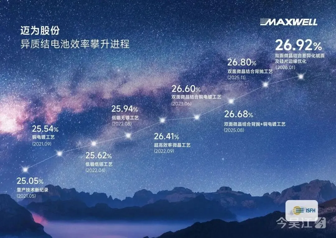 这一突破并非一蹴而就,而是建立在多年技术积淀之上,更是苏州坚持科技创新、培育优质企业的生动缩影。早在多年前,迈为股份就已在异质结电池领域创下重要里程碑。2021年5月,迈为股份研制的异质结电池首次实现25.05%的量产技术纪录,一举站稳行业领先位置;时隔近五年,公司再次突破技术瓶颈,将光电转换效率提升至26.92%,实现了1.87个百分点的跨越,持续彰显苏州企业的创新实力与发展韧性。