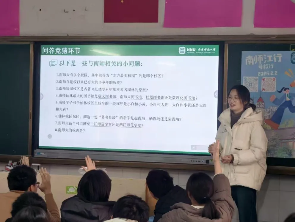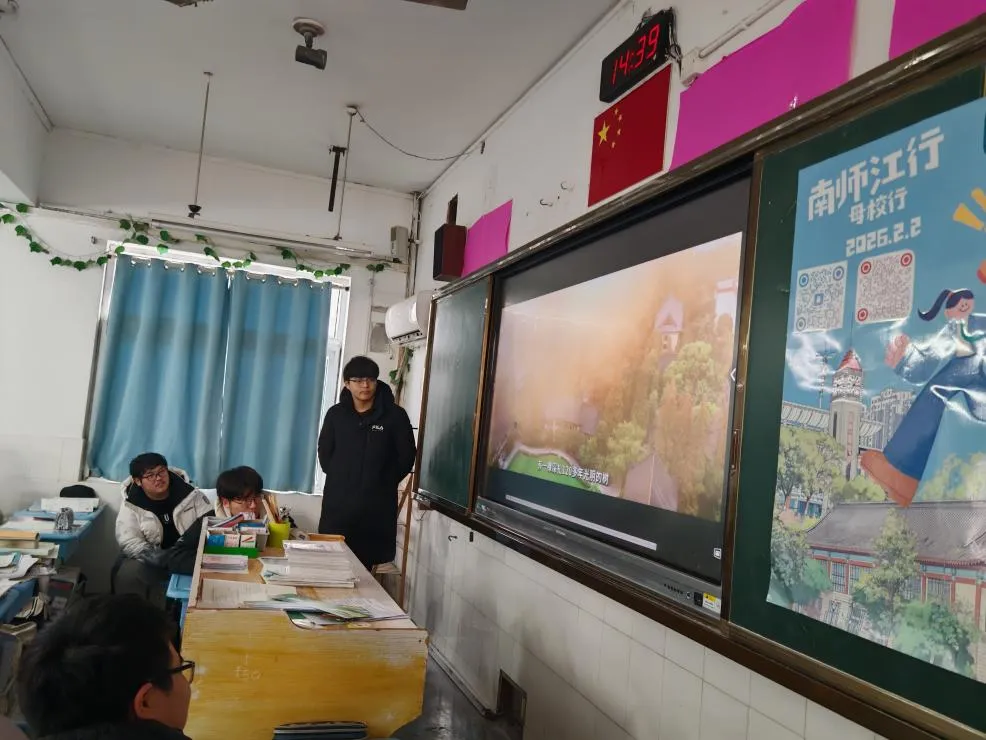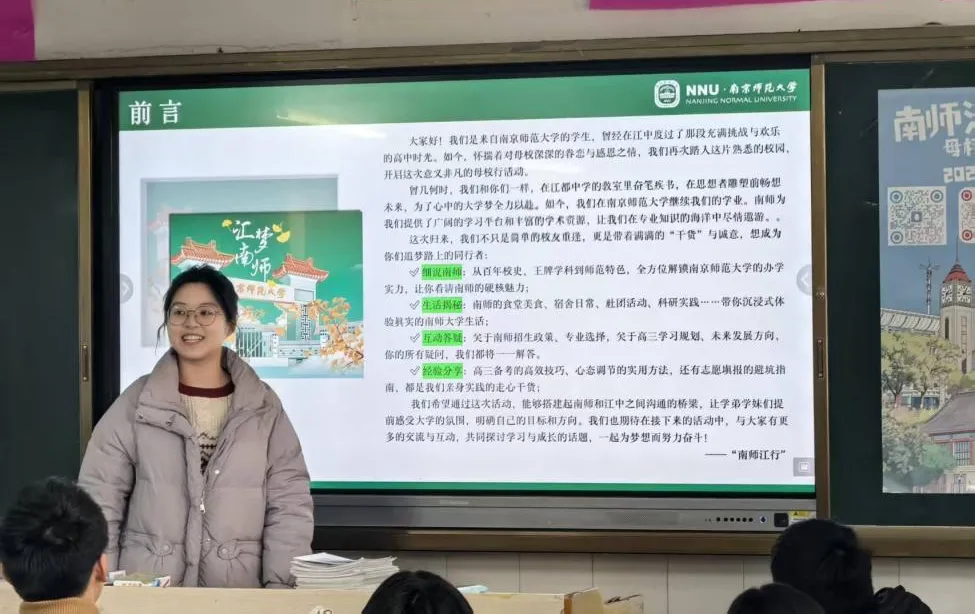为搭建起高校与中学之间的桥梁,让更多优秀学子深入了解南师的独特魅力与深厚底蕴,吸引更多怀揣梦想的学弟学妹报考我校。2月2日下午,毕业于江都中学的南师学子们自发组建“南师江行”小队,怀揣着激动的心情回到了我们的高中母校——江苏省江都中学,开展南京师范大学优秀学子“母校行”宣讲活动。