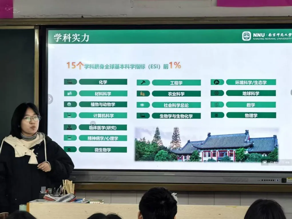 选择南师,既因其学科实力,也因它是个人成长摇篮。朱静同学就此展开介绍:她罗列我校王牌专业、国家级重点学科及科研突破,为学弟学妹选专业提供参考;还讲解校园环境、餐饮、学习设施与娱乐选择,PPT里的美食和校园风景,瞬间点燃大家热情,现场赞叹不断。