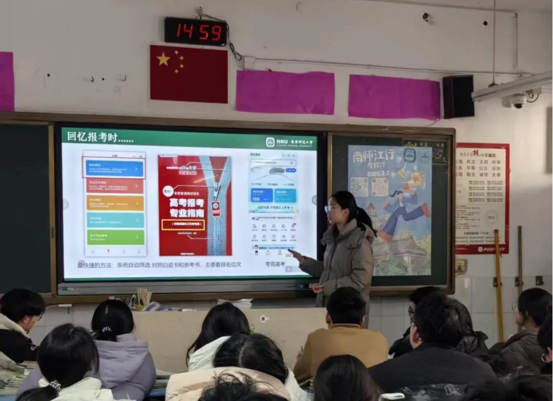 叶静怡同学结合自身经验,为学弟学妹们带来了实用的报考指南。她梳理南师近年录取分数线、招生人数与各专业报考热度,讲解志愿填报的思路和实用技巧,还叮嘱学弟学妹们总结学习方法、调整心态应对高考。内容细致且实用,帮大家更从容地面对高考与志愿填报。