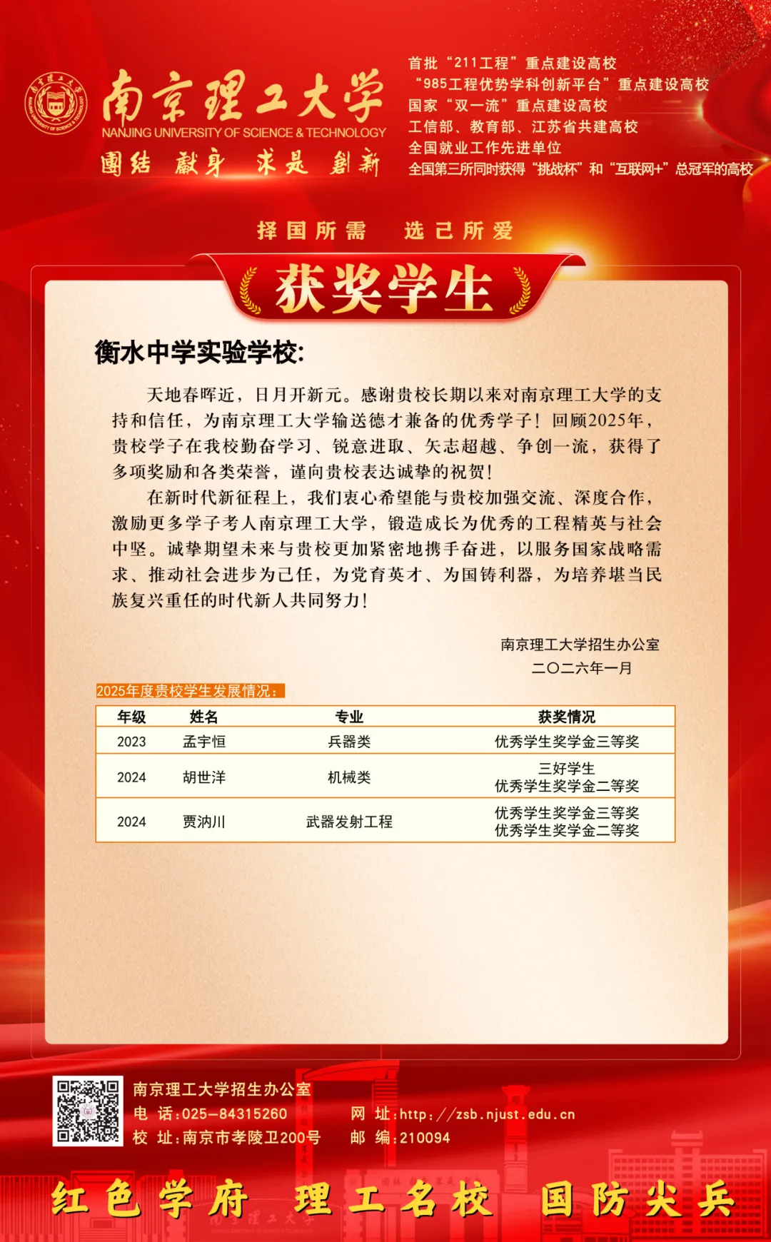 近日,南京理工大学向我校发来喜报,祝贺我校毕业生孟宇恒获优秀学生奖学金三等奖,胡世洋获三好学生、优秀学生奖学金二等奖,贾汭川获优秀学生奖学金三等奖、优秀学生奖学金二等奖。