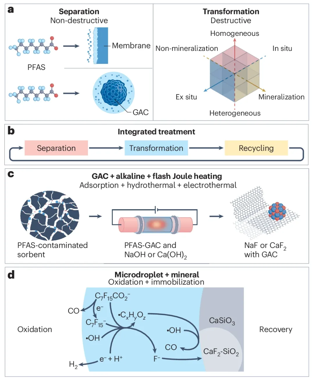 图1:a、非破坏性分离技术(例如膜过滤或颗粒活性炭(GAC)吸附)和破坏性转化方法(可按相态(均相与非均相)、应用地点(原位与异位)和完全性(矿化与非矿化)进行分类)。b、全氟和多氟烷基物质(PFAS)修复的混合方法。c、一种实现PFAS去除净零成本的吸附-热解-循环工艺。d、一种基于微滴的工艺,可在矿物颗粒存在下同时实现界面还原和氧化以及氟固定。