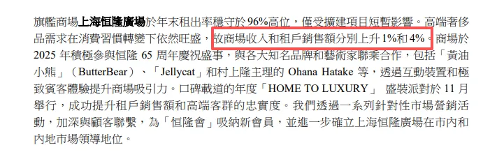再来看上海恒隆广场,据恒隆地产2025年业绩公告显示,2025年,上海恒隆广场商场收入和租户销售额分別上升1%和4%,表中为135亿元,同比上升约1.20%,相比企业发布数据的增长率稍低些。但事实上,众所周知,这些“顶奢商场”销售额一般都不会在财报中或官方渠道出现,因此,2024年该商场市场公开的销售额也无法判定有多少偏差,但增长是肯定的。