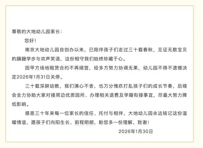 随着落户时间的逐步临近,预计在接下来的春节假期前后,市场成交热度仍然会维持继续上升的情态,建议有实际需求的购房客户,尽可能早点进行看房,以达成能够顺利落户的入学要求。毕竟在实际交易过程中,有些卖方需要银行解压,还有些需要买方户口迁出、买方户口迁入等,这些都需要时间,同时也建议售房业主抓住这一波成交高峰,达成自己置换或资金方面的需求,不要过度执着一些很小的议价空间差距。在刚刚过去的1月底,南京秦淮区一所经营了30年的幼儿园——大地幼儿园宣布关停。官方发布的理由是因为场地租赁合约不再续签,而导致突然关停。事实上,幼儿园的关停在南京已经出现很多回了。