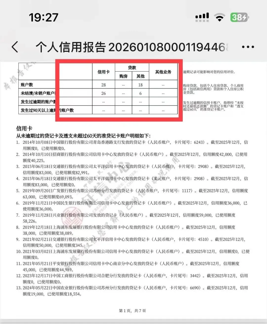 如下图征信:信用卡26张,除去共享或Visa卡外,在用15张共计45W元,小贷共计6笔,平均年化9%,共38W。最重要的是,根据征信显示基本是“爆卡”状态,也就意味着差不多山穷水尽了