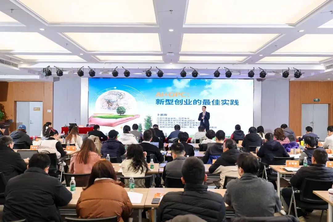 开班式后,大任智库创始人、江苏省工商联人工智能委员会秘书长、江苏省数字经济联合会副会长兼秘书长卜安洵以《AI+OPC:新型创业的最佳实践》为题讲授首场专题课程。卜老师围绕“数字化演进与AI创业时代”“OPC创业赛道与项目定位”“OPC商业模式和成功法则”以及“OPC社区建设与赋能体系”四大模块,系统阐述了在AI驱动下创业范式从“人力驱动”向“人机共创”的深刻变革。