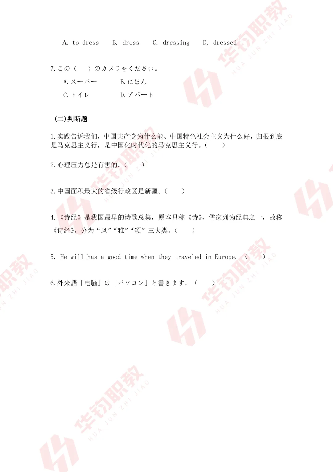 测试题型:单选题(80题),判断题(20题),共计100题