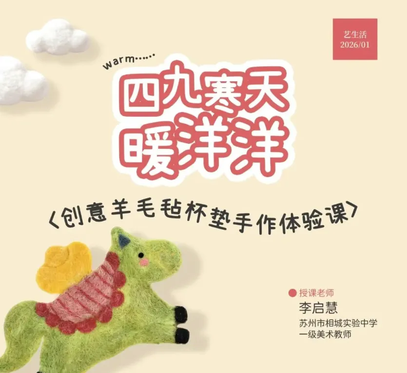 寒意渐深的四九天,苏州美术馆的前厅却被一份指尖的温暖轻轻包围。2026年1月17日下午,一场以“四九寒天暖洋洋”为主题的创意羊毛毡杯垫手作体验课在此展开。我们特邀苏州市相城实验中学的李启慧老师授课,带领大小朋友以羊毛为媒,触碰非遗的温度,共创一份冬日里的柔软记忆。