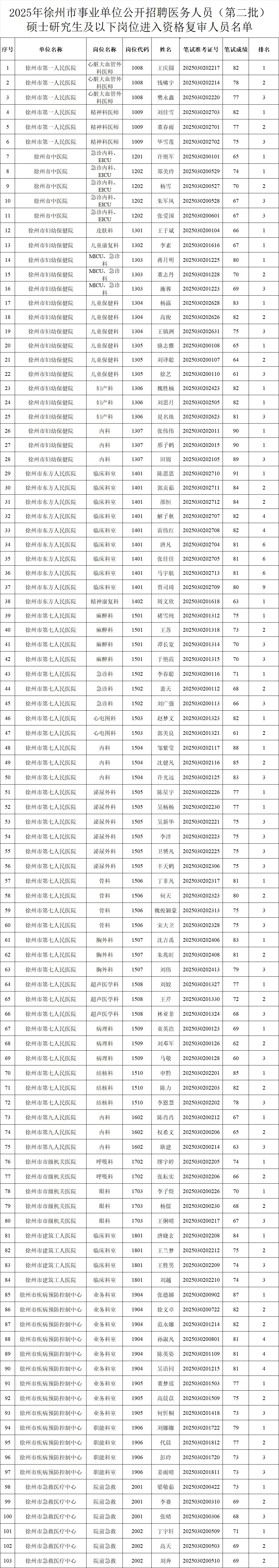 2.2025年徐州市事业单位公开招聘医务人员(第二批)硕士研究生及以下岗位进入资格复审人员名单