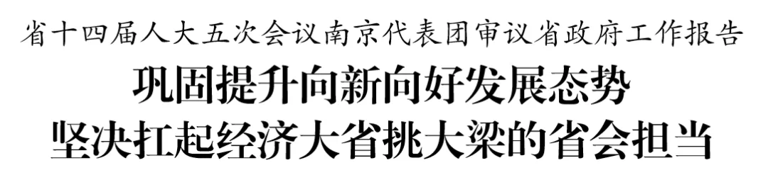 会场内气氛热烈,代表们结合自身工作实际,谈变化、谋发展、话未来。省人大代表、市委书记周红波说,省政府工作报告通篇贯穿习近平总书记对江苏工作重要讲话精神,深入贯彻党的二十届四中全会精神,全景展现了“十四五”时期“强富美高”新江苏建设的生动实践,系统谋划了我省“十五五”发展的战略抓手、关键举措,充分彰显了经济大省的底气韧性和勇挑大梁的责任担当,是一个提振信心、凝聚人心、顺乎民心的好报告。报告中多处明确提到南京,充分体现了省委省政府对南京的重视和期待。去年以来,南京发展呈现出经济运行、发展动能、城市品质、政治生态“四个向新向好”的良好态势。“十五五”开局之年,将坚决扛起“走在前、做示范、挑大梁”重大责任,重点聚焦推动经济稳中向好、培育发展新质生产力、建设现代化人民城市、推进共同富裕等方面,着力塑造发展新动能新优势,切实把省会担当体现到对全省发展的贡献度、代表江苏产业科技创新水平的硬实力、对省内及都市圈其他城市发展的带动力上,不断提升创新能级、产业能级、开放能级。