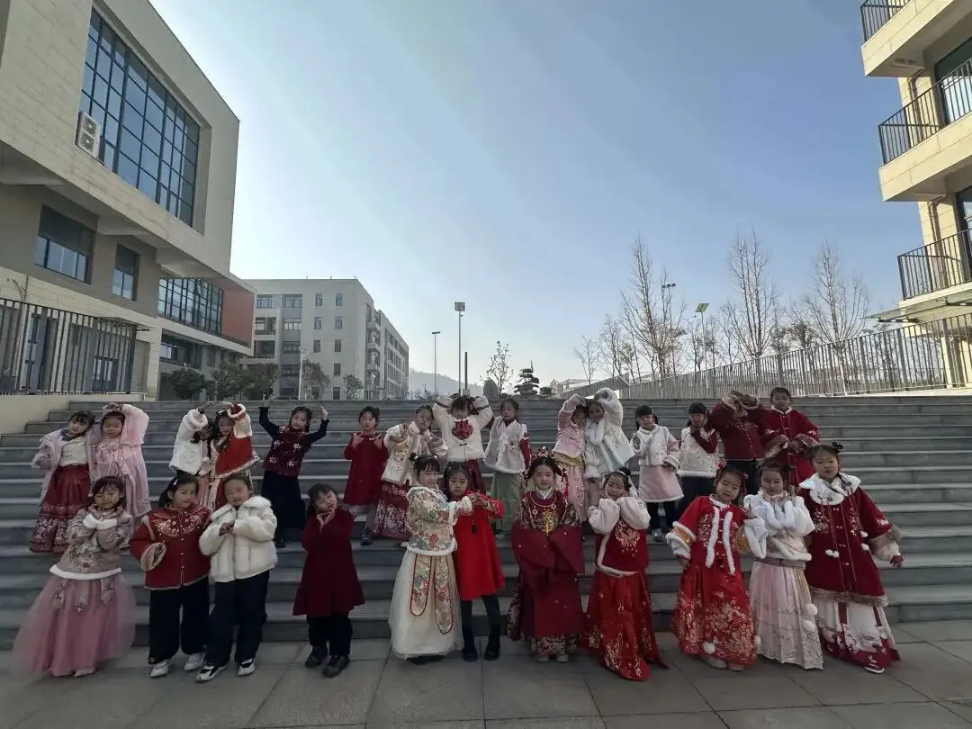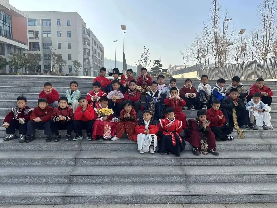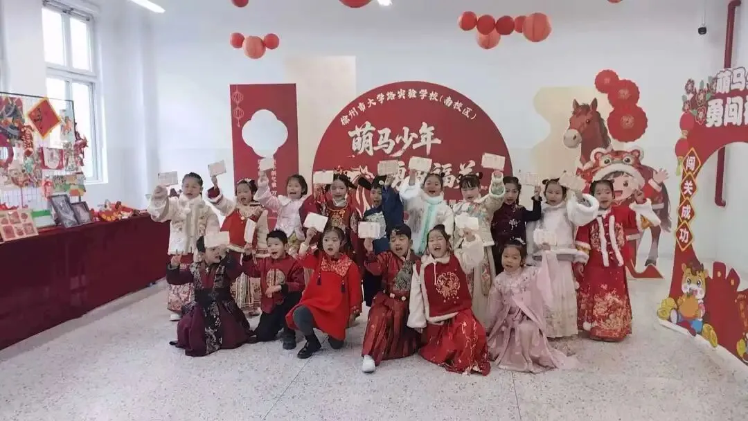 在“萌马少年勇闯福关”游考活动中,孩子们身着汉服穿梭在各个闯关游戏里,开开心心答问题,把知识和年味一起装进了口袋。石阶上的集体合影、教室里举着通关卡的笑脸,都藏着他们在传统与趣味中收获的成长与欢喜。