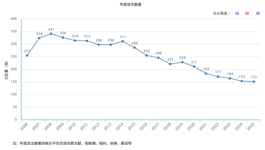 解读:从年度总文献量可以看到本刊2024年度总发文量为153篇,作为一本大学学报月刊,2025年度已经实现全年上线检索,总发文量为151篇,由此可以说明本刊虽然收稿量不大,但是编辑部审稿不拖拉,上线周期短。
