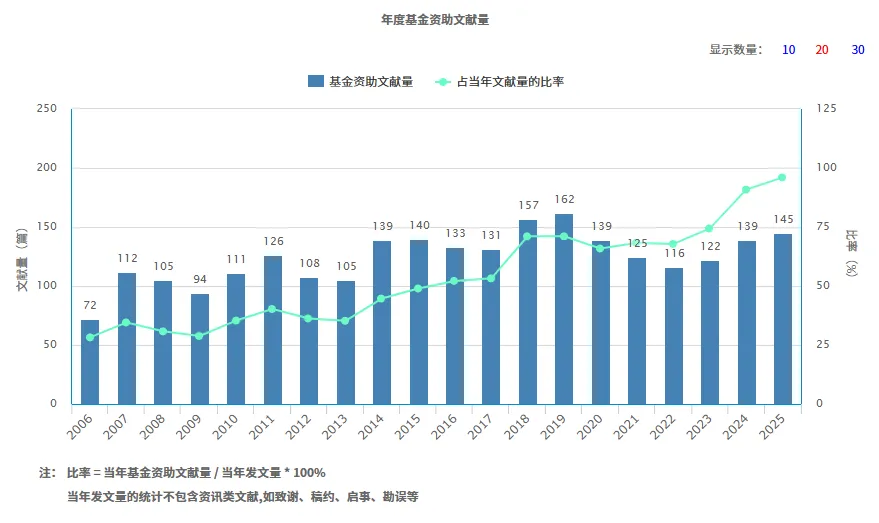 从年度基金资助文献量可以看到本刊2024年度基金资助发文量为139篇,基金资助文献比率为90.85%,2025年度基金资助发文量为145篇,基金资助文献比率为96.03%,由此可以说明本刊对基金课题的要求比较高,没有基金课题资助的话,不建议您投本刊。