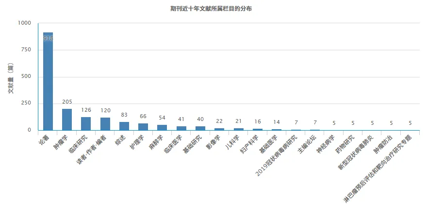 从期刊近十年文献所属栏目的分布可以看到本刊近十年收稿栏目当中,论著栏目的收稿量最大。