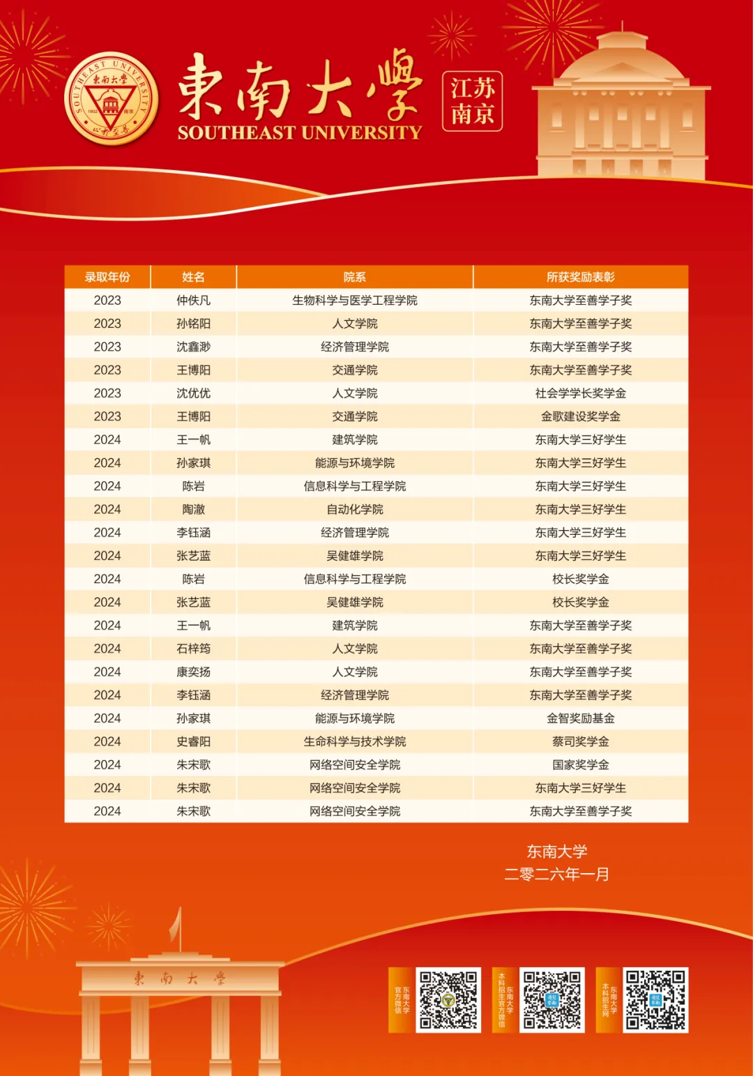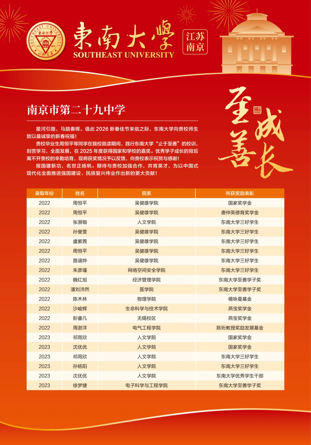 近日,东南大学向南京市第二十九中学发来喜报,对二十九中学毕业生在大学的卓越发展予以高度赞扬。喜报中指出,二十九中学子在东南大学求学期间,不仅展现出扎实的学业功底与出色的科研潜质,更以全面的综合素养赢得广泛认可。多位学子荣获国家奖学金、课程奖学金等多项殊荣,更有学子在各类学科竞赛、科创项目中脱颖而出,展现了二十九中人“厚德自强、纯正卓越”的精神底色。这份沉甸甸的喜报,既是东南大学对二十九中育人成果的又一次权威肯定,也是对二十九中学子持续奋斗、追光而行精神的最佳褒奖。