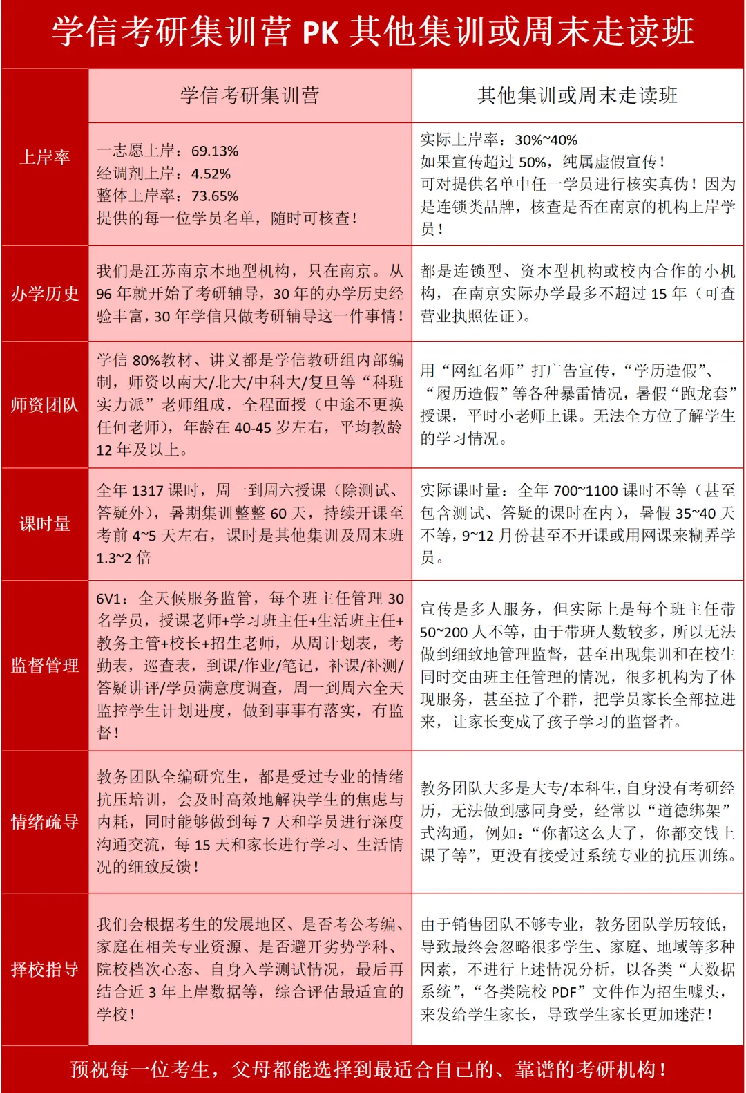 学信考研具有28年办学史,江苏最悠久的考研辅导学校,更懂教学、监管、提分。目前“口碑式”“推荐式”学员已达到学信的70%占比!