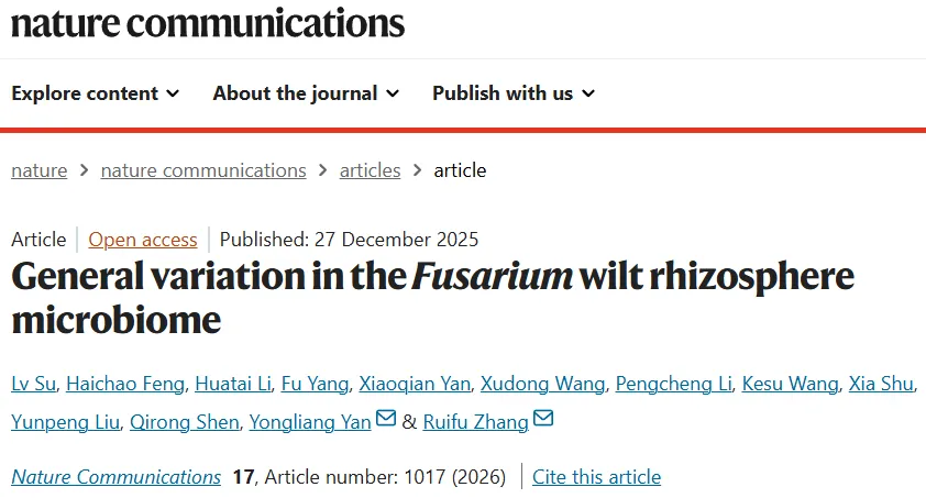 2025年12月27日,国际权威期刊《Nature Communications》发表了南京农业大学资源与环境科学学院沈其荣院士团队张瑞福教授课题组的研究成果《General variation in the Fusarium wilt rhizosphere microbiome》。该研究通过多组学数据整合与实验验证,系统揭示了致病镰刀菌入侵下根际微生物组稳定的变化特征,阐明了益生黄杆菌通过根系分泌物生育酚介导的富集机制,为土传病害的生态防控提供了理论依据与策略。