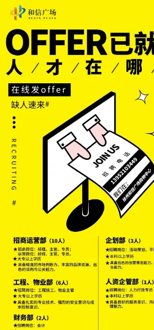 可以看到招聘的岗位和部门还是很多的,包括招商运营部、企划部、工程物业部、人资企管部、财务部,从经理到专员都有招聘,这是一个商场运营的主要架构。