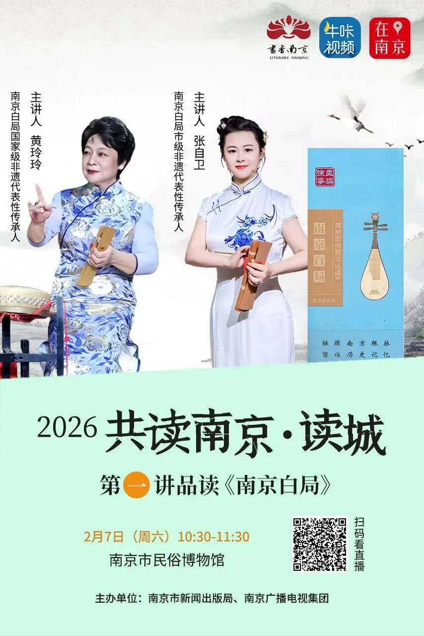 2月7日(周六), “2026共读南京·读城”走进南京市民俗博物馆,南京白局国家级非遗代表性传承人黄玲玲携弟子南京白局市级非遗代表性传承人张自卫品读《南京白局》,书香南京大讲堂全媒体直播。